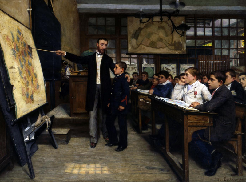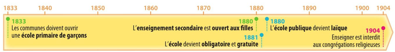 Le 19e siècle est celui de l’alphabétisation des petits Français. La loi Guizot (1833) installe une école primaire par commune, puis la loi Falloux (1850) favorise la création de nombreux collèges d’enseignement libre. Cette politique, poursuivie sous le Second Empire par Victor Duruy, est parachevée sous la 3e République par Jules Ferry, qui instaure l’enseignement primaire obligatoire et gratuit (1881).